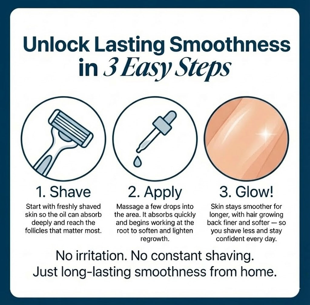 It’s simple: the oil works by targeting the hair follicle directly. When applied after hair removal (like shaving or waxing), the natural plant compounds penetrate the follicle to slow down regrowth and weaken the hair at the root. Over time, hair grows back finer, lighter, and much slower.